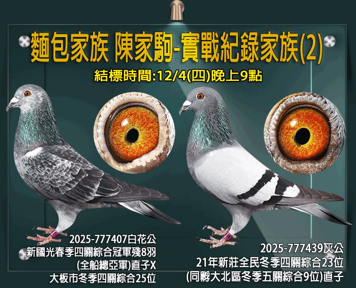在2021年冬季北海賽事可說是大獲全勝的”麵包家族”陳家駒,表現成績令人驚豔。同孵作出入賞新莊全民分會四關綜合23位(殘42羽)與桃園大北區五關綜合9位(殘230羽);苗栗薪苗六關綜合6位(殘101羽)、新北市海翔分會五關綜合14位(殘116羽)種鴿提供、三重自強分會五關綜合32位(殘124羽)、板橋大板市五關綜合109位、126位(殘127羽、板橋大板市五關綜合40位、42位(種鴿提供),可說是轟出滿貫的全壘打。