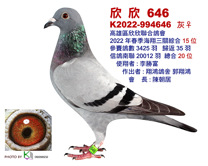 22-994646春季高雄欣欣3425羽三關綜合15位(殘35羽)