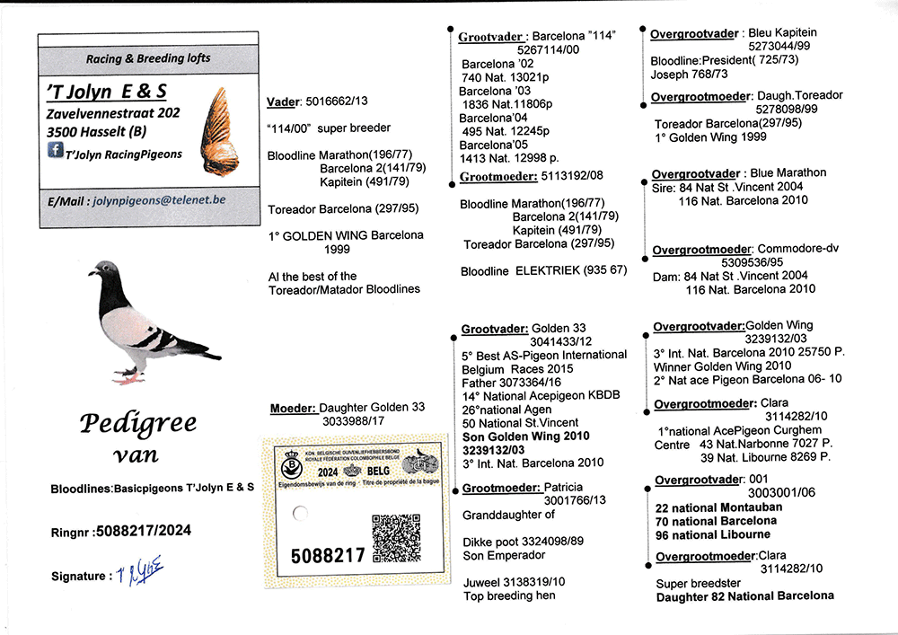比利時裘林兄弟「T'JOLYN-PIGEONS」鴿舍30年來致力於培育最好的100%近親血統。T'Jolyn 鴿舍的基礎種鴿的後代為:「巴塞隆納鬥牛士」、「巴塞隆納桂冠鴿」、「超級金」、「巴塞隆納冠軍」、「馬拉松冠軍」、「未來最好的」等經典的鴿系!