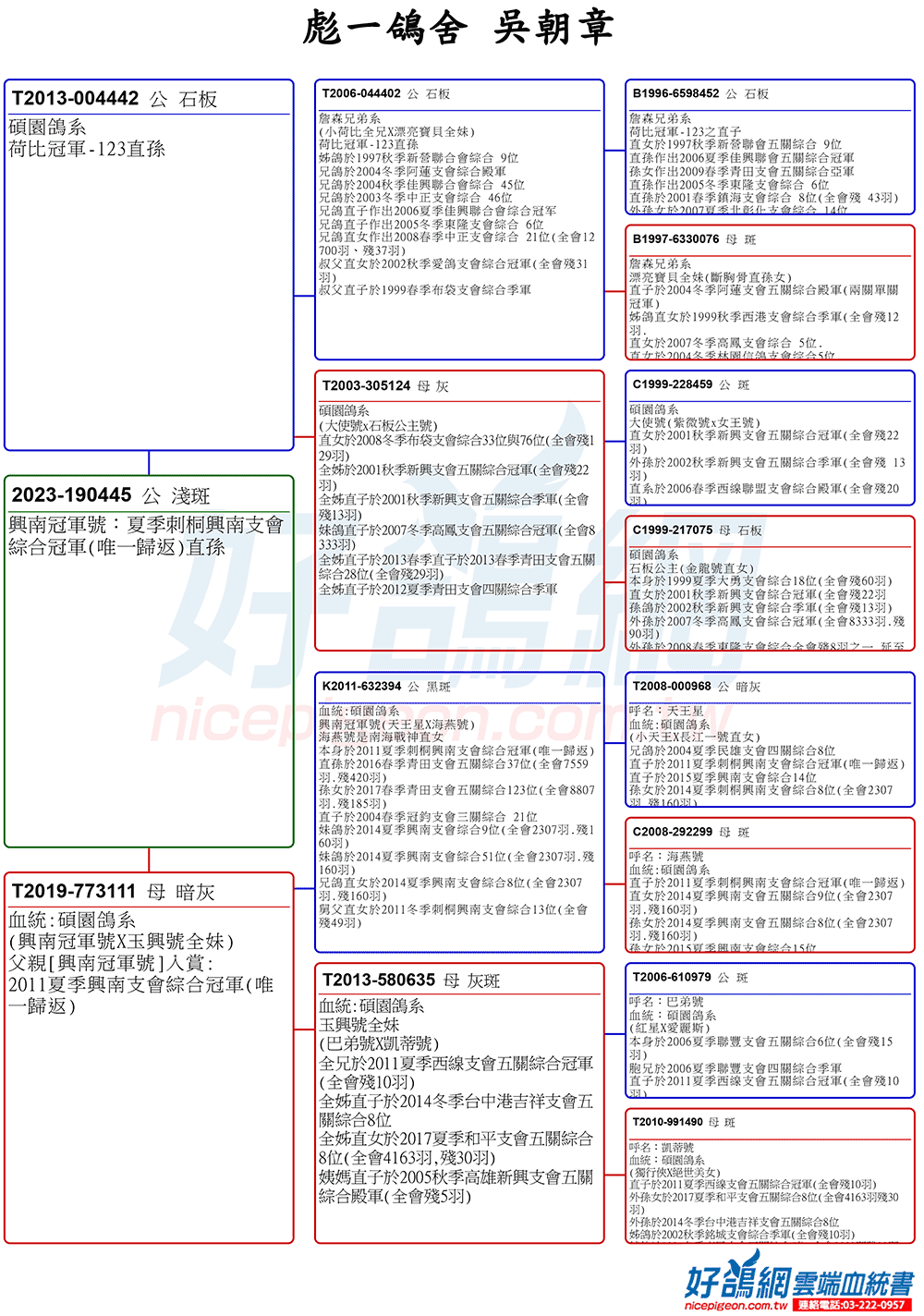據了解,吳朝章多年前也引入海翔名家許庭碩(許明純)的白花鴿系,眾所皆知許董鴿系成績優異,許多名家名舍都有出現碩園鴿舍-許庭碩鴿系的身影。所以吳朝章也大手筆引進許多羽高代的白花家族增加戰力。例如白色太陽(春季社皮七關綜合冠軍殘四羽、延聯輪殘25羽全船總冠軍)、玉興號(夏季西線五關殘10羽綜合冠軍,全船總合7位)、金龍號近親家族等勇猛悍將。在2023年艱困的冬季賽,榮獲北海金溪湖12066羽四關綜合亞軍(殘74羽)、三關綜合75位(殘97羽)就是一個明證。
