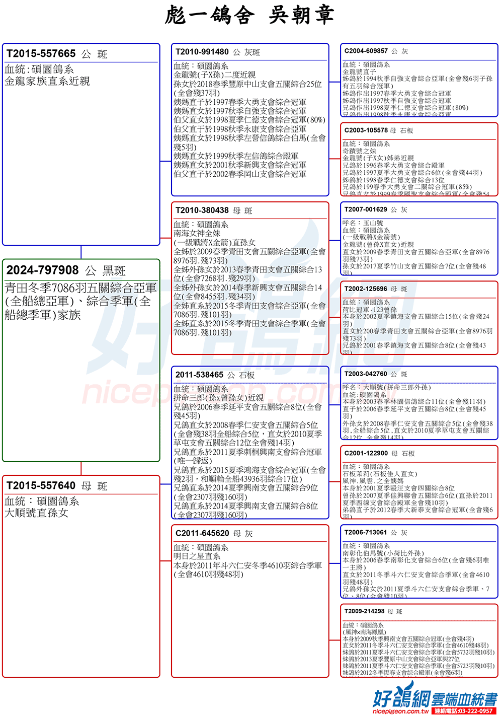南海先鋒號(春季新興五關綜合殿軍)孫女;同輩:17冬季天宇6793羽六關綜合10位(殘25羽)、15夏季新興7100羽綜合6位(全會殘10羽,大山輪全船38064羽綜合12位)