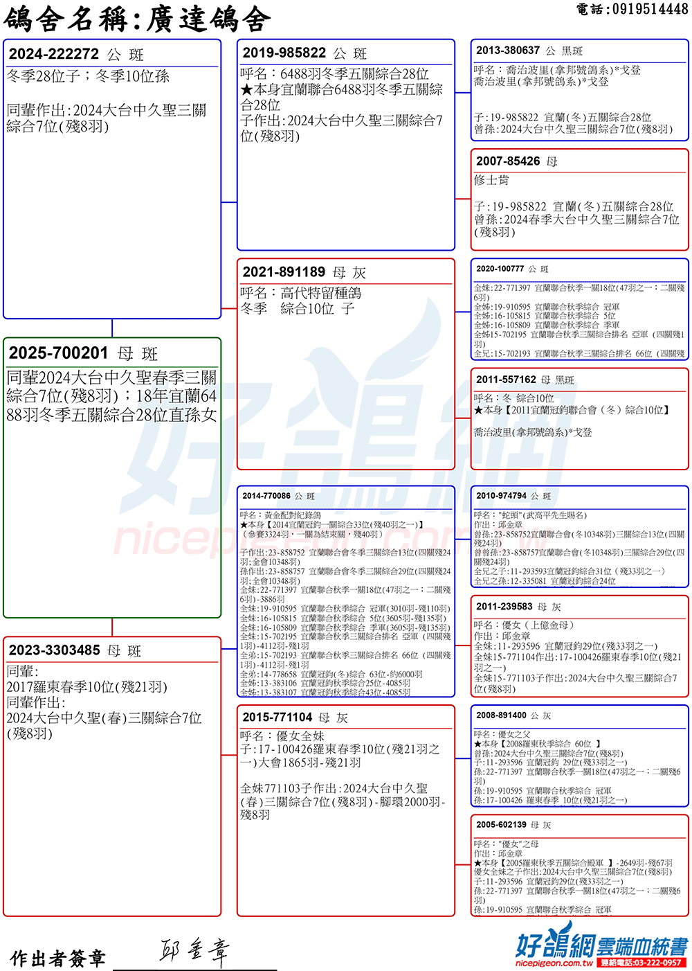 同輩2024大台中久聖春季三關綜合7位(殘8羽);18年宜蘭6488羽冬季五關綜合28位直孫女