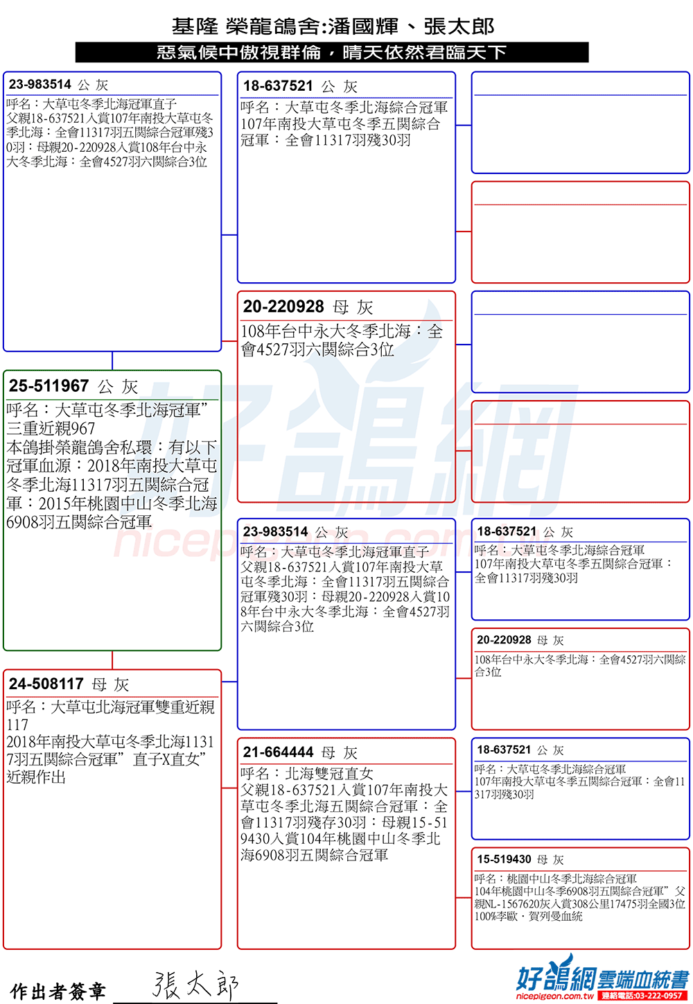 2023年春季北海宜蘭聯合會全會7165羽殘34羽,由基隆榮龍鴿舍潘國輝.張太郎作出23-762818灰母(使翔:邱宏,教練:陳志翔),入賞三關綜合14位。