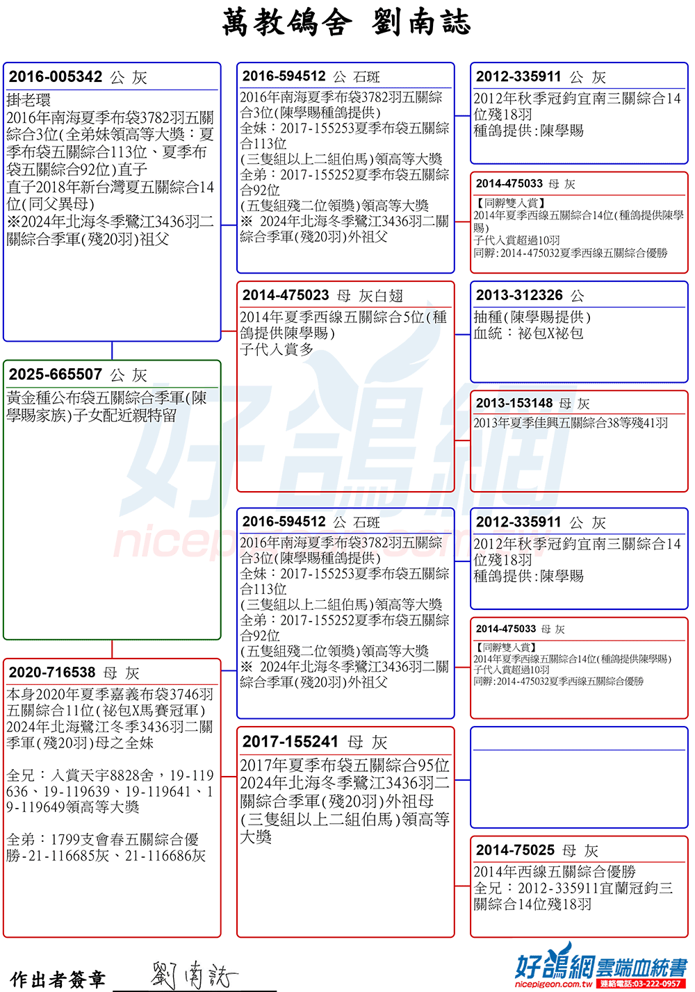 台南學甲的劉南誌是秘包系名家,家中映入眼簾的多不可數的入賞鴿照,更引人注意的是,入賞鴿照幾乎都是以灰鴿系為主,也表示秘包優秀血緣強勢的遺傳基因讓萬教鴿舍-劉南誌的整體水準一致,可見多年來嚴謹的配對與持續穩定的入賞成績,都是日積月累的經驗所換來的甜蜜果實。