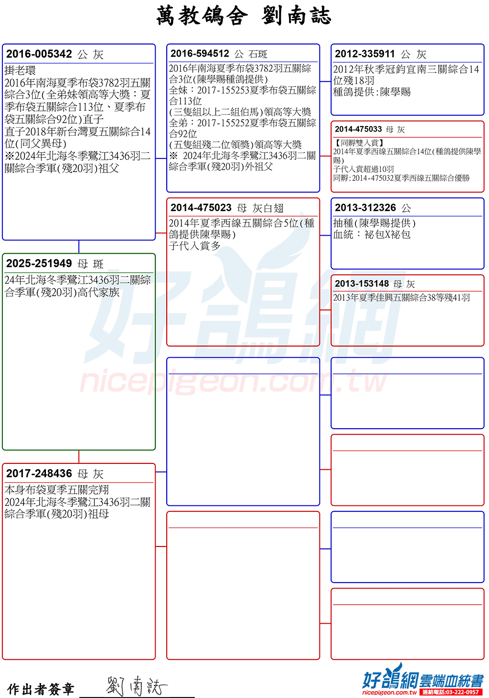 台南學甲的劉南誌是秘包系名家,家中映入眼簾的多不可數的入賞鴿照,更引人注意的是,入賞鴿照幾乎都是以灰鴿系為主,也表示秘包優秀血緣強勢的遺傳基因讓萬教鴿舍-劉南誌的整體水準一致,可見多年來嚴謹的配對與持續穩定的入賞成績,都是日積月累的經驗所換來的甜蜜果實。