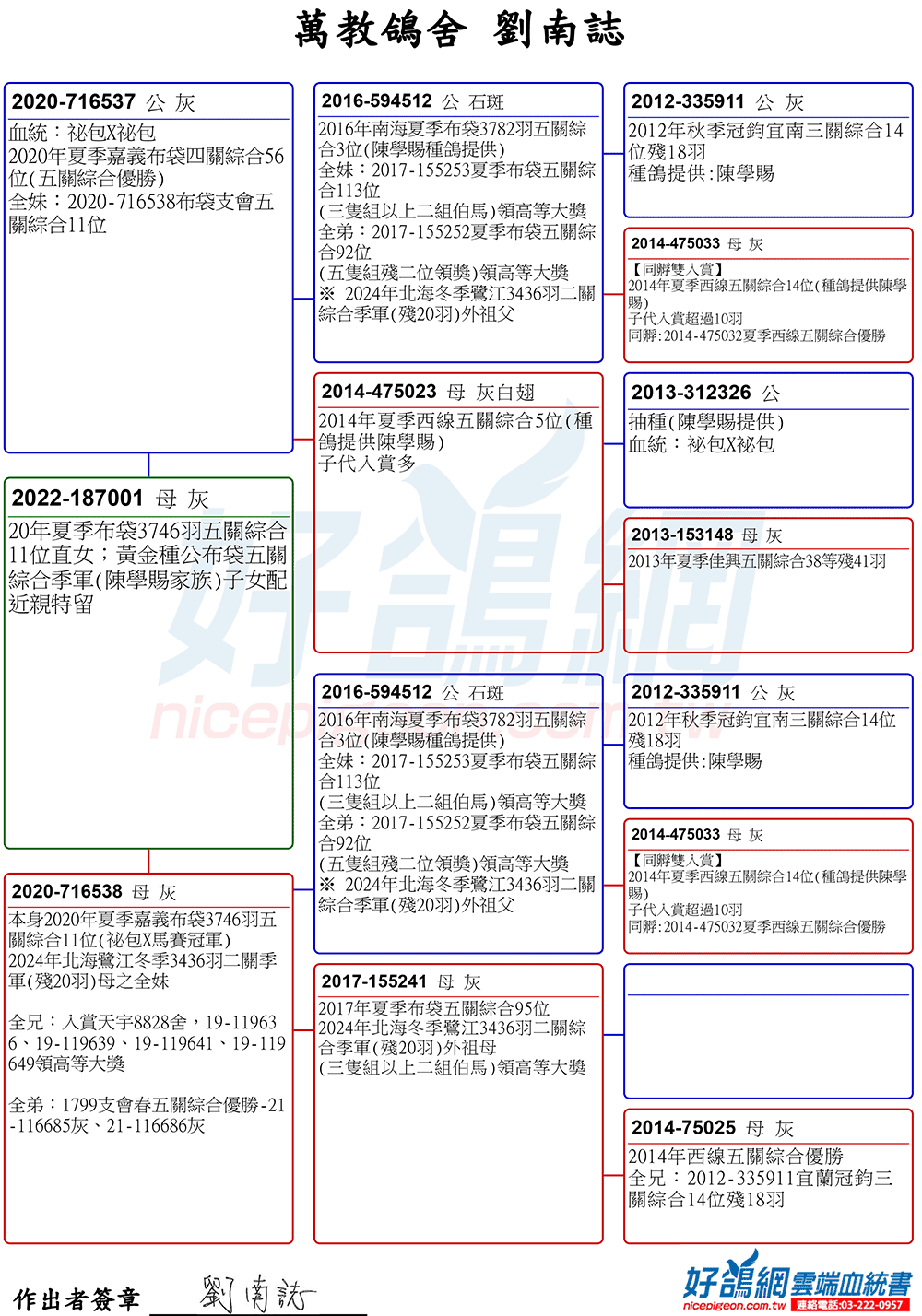 20年夏季布袋3746羽五關綜合11位直子;黃金種公布袋五關綜合季軍(陳學賜家族)子女配近親特留