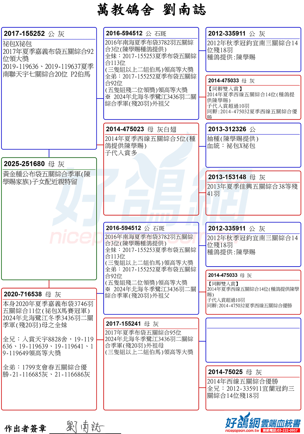 台南學甲的劉南誌是秘包系名家,家中映入眼簾的多不可數的入賞鴿照,更引人注意的是,入賞鴿照幾乎都是以灰鴿系為主,也表示秘包優秀血緣強勢的遺傳基因讓萬教鴿舍-劉南誌的整體水準一致,可見多年來嚴謹的配對與持續穩定的入賞成績,都是日積月累的經驗所換來的甜蜜果實。