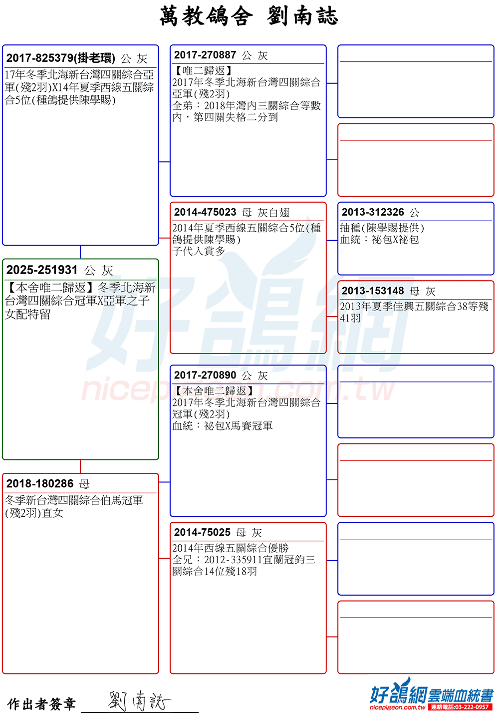 台南學甲的劉南誌是秘包系名家,家中映入眼簾的多不可數的入賞鴿照,更引人注意的是,入賞鴿照幾乎都是以灰鴿系為主,也表示秘包優秀血緣強勢的遺傳基因讓萬教鴿舍-劉南誌的整體水準一致,可見多年來嚴謹的配對與持續穩定的入賞成績,都是日積月累的經驗所換來的甜蜜果實。
