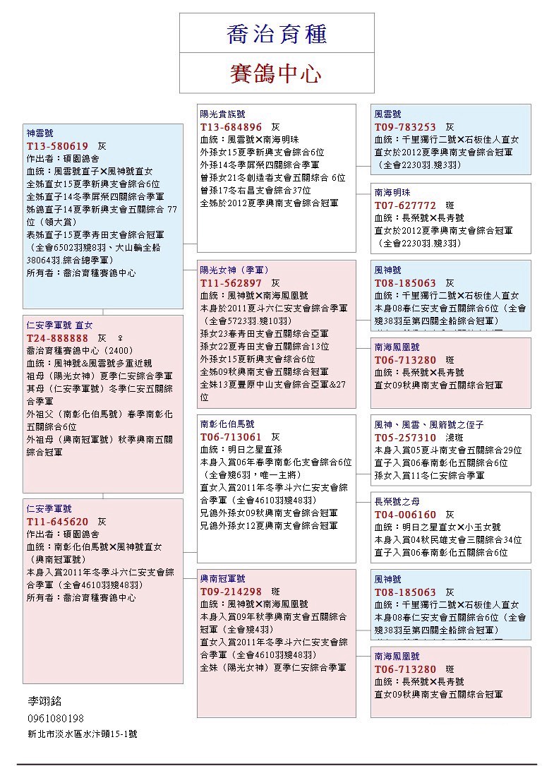 超級888特留種鴿;斗六仁安4610羽綜合季軍(殘48羽)直女;青田夏季殘8羽冠軍(大山輪全船總季軍)家族
