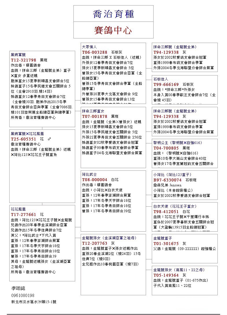 冬季桃園大北區五關綜合41位全弟(原配對)之子;2019年冠聖春季五關綜合20位(殘30羽)家族