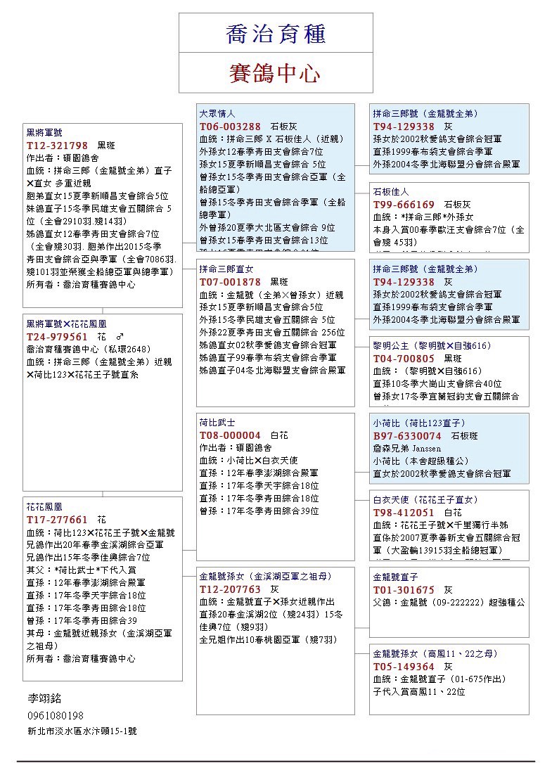 冬季桃園大北區五關綜合41位全弟(原配對)之子;2019年冠聖春季五關綜合20位(殘30羽)家族