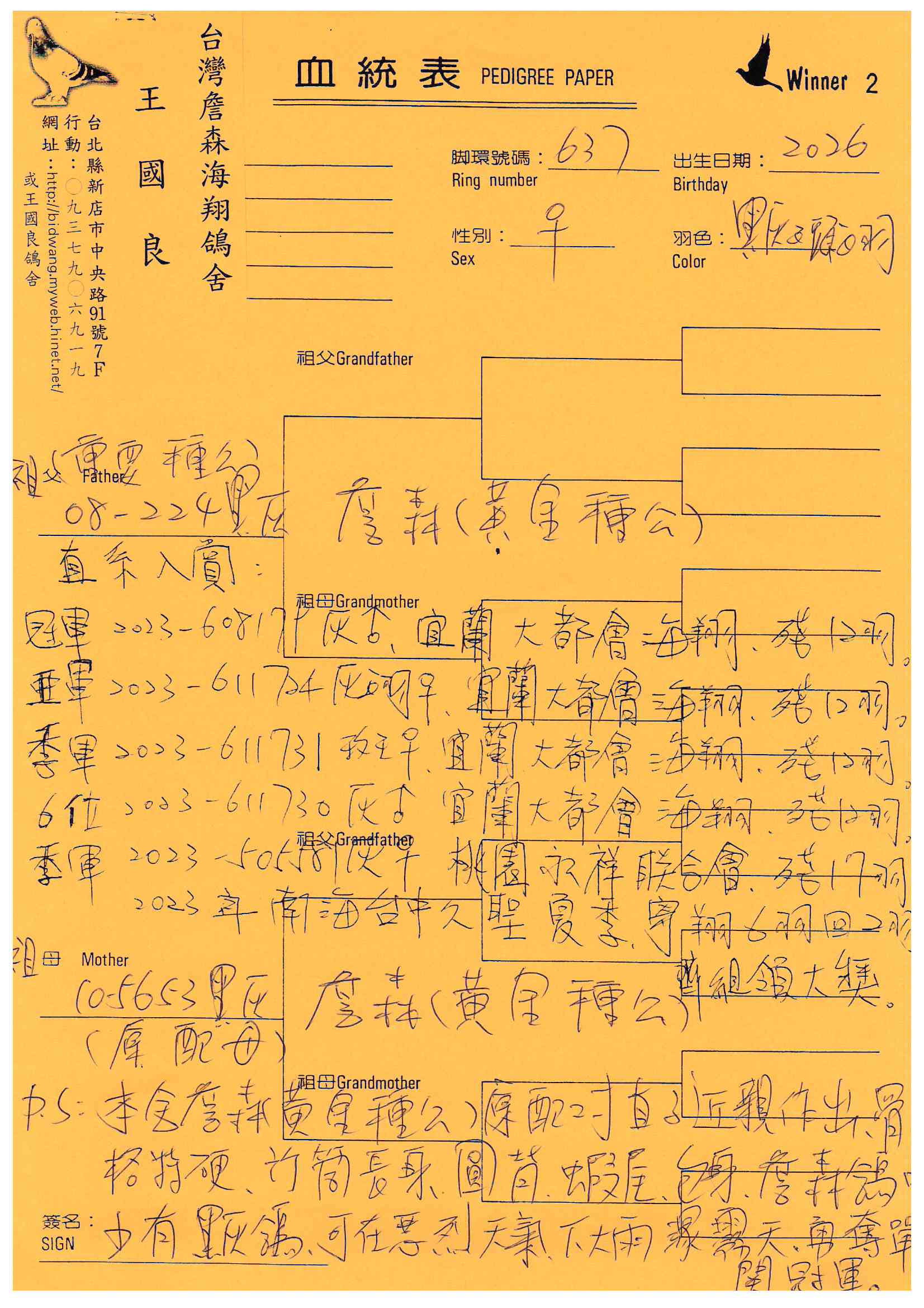 以飼養四季都能入賞詹森系聞名的新店王國良,舍內種鴿皆是詹森家族相互作育而成,能保有詹森系統的特色與優勢。從本身作出參賽和絡繹不絕種鴿提供資訊等各式入賞鴿照,得以知曉王國良的詹森家族威名絕非虛構。近年來王國良年紀漸長,開始減少參賽僅以少數寄翔興趣為主,愛鴿心切的他,期望能讓四季都能入賞的詹森家族在各地發光發熱,所以特別將舍內作育的一線主力高代種鴿分享,透過多年來豐富的參賽與作育經驗,讓惡氣候歸返聞名的詹森家族優良血脈,傳承各地賽場開枝散葉,如此一為,也是作為養鴿人多年的肯定吧!