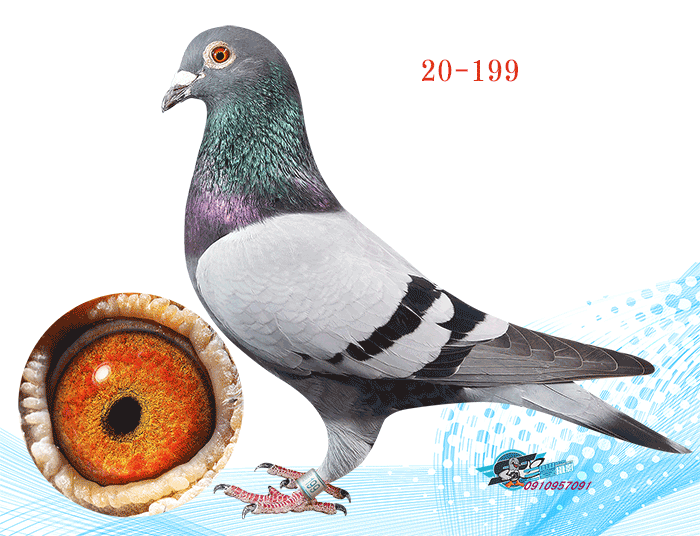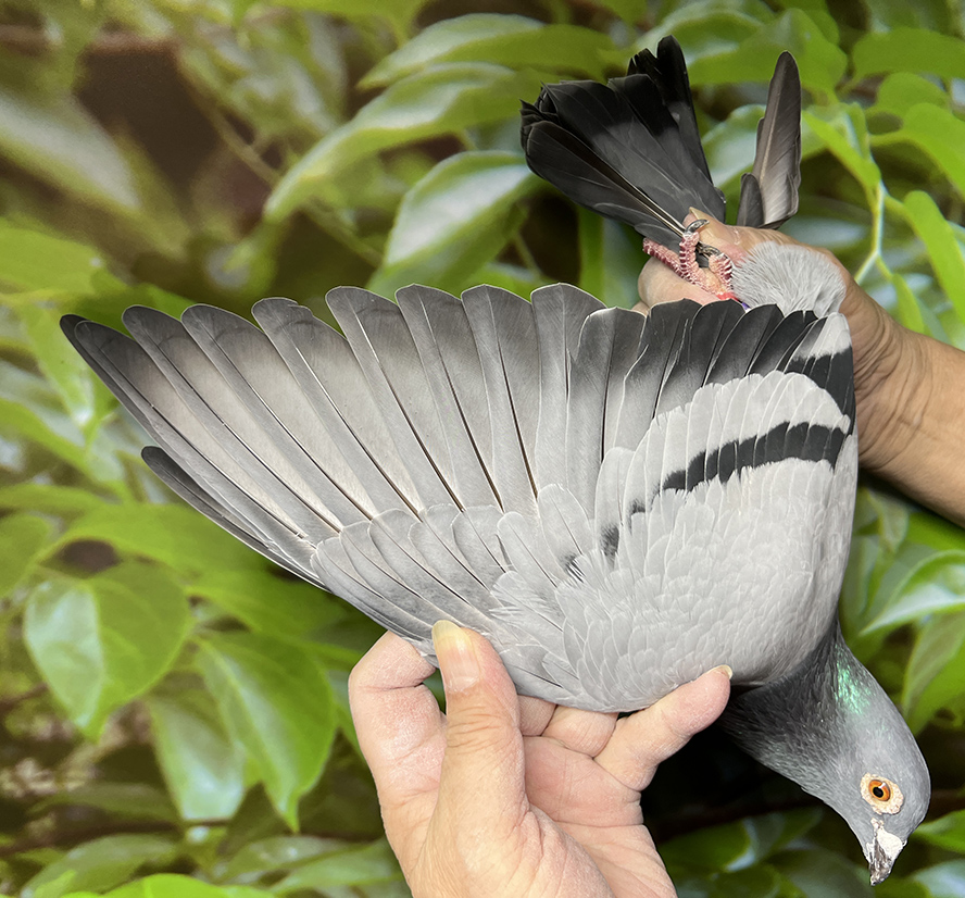 本舍(唯一歸返號)原配對作出,竹筒長身,圓背,包身,蝦尾,抓在手中全身硬朗,整體結實,是一羽標準種母,可配本舍任何一線詹森,定有成績,可參考本舍入賞紀錄鴿,體型皆同。