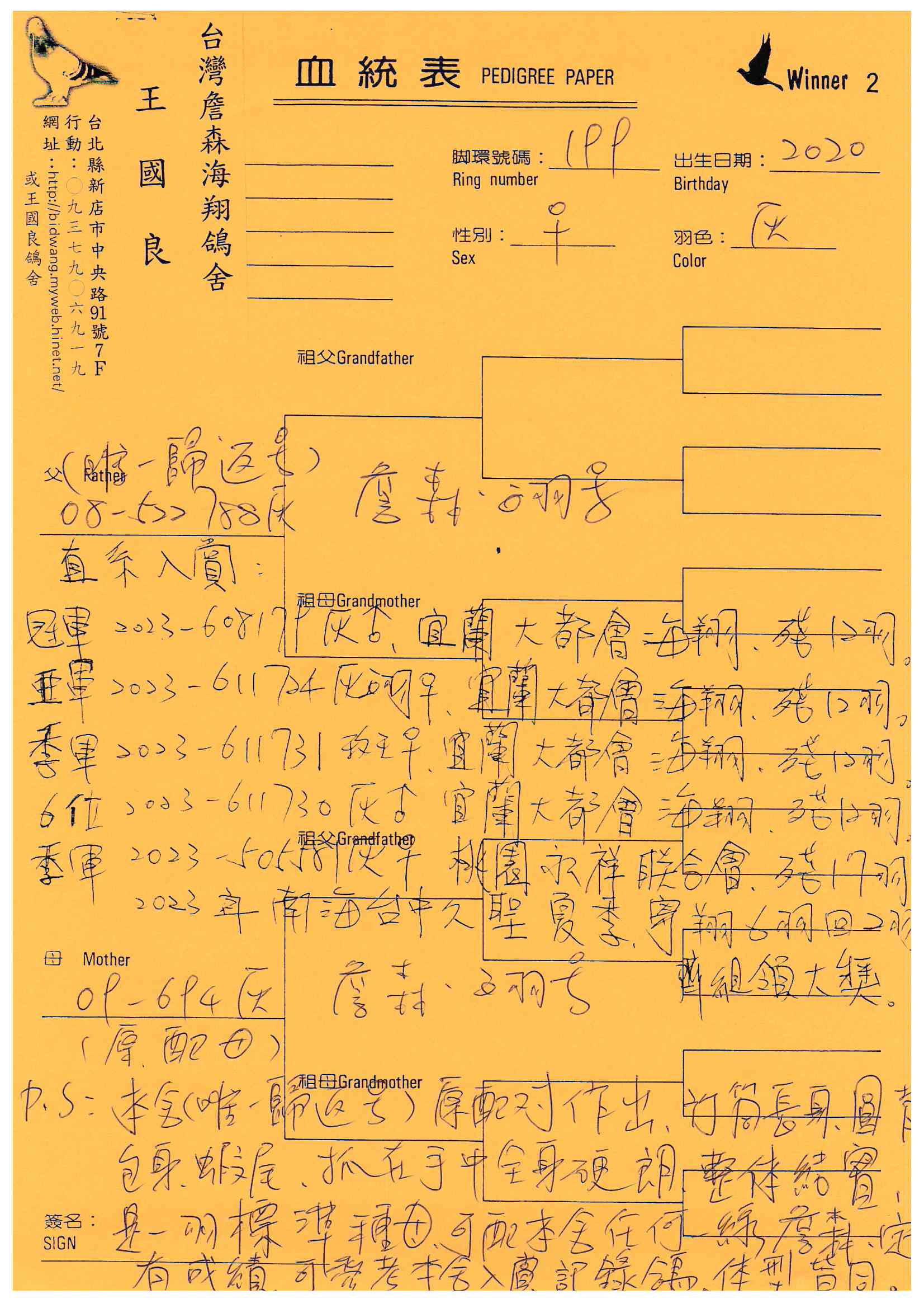 以飼養四季都能入賞詹森系聞名的新店王國良,舍內種鴿皆是詹森家族相互作育而成,能保有詹森系統的特色與優勢。從本身作出參賽和絡繹不絕種鴿提供資訊等各式入賞鴿照,得以知曉王國良的詹森家族威名絕非虛構。近年來王國良年紀漸長,開始減少參賽僅以少數寄翔興趣為主,愛鴿心切的他,期望能讓四季都能入賞的詹森家族在各地發光發熱,所以特別將舍內作育的一線主力高代種鴿分享,透過多年來豐富的參賽與作育經驗,讓惡氣候歸返聞名的詹森家族優良血脈,傳承各地賽場開枝散葉,如此一為,也是作為養鴿人多年的肯定吧!