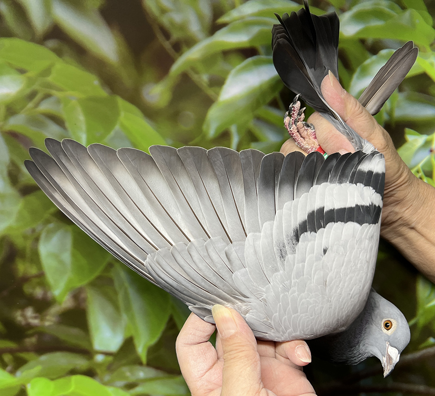 本舍(唯一歸返號)原配對直子近親作出,圓背,包身,蝦尾,竹筒長身,骨骼粗硬,是一羽相當完美超級金母鴿,可配本舍(佰萬種公)下代定有成績。