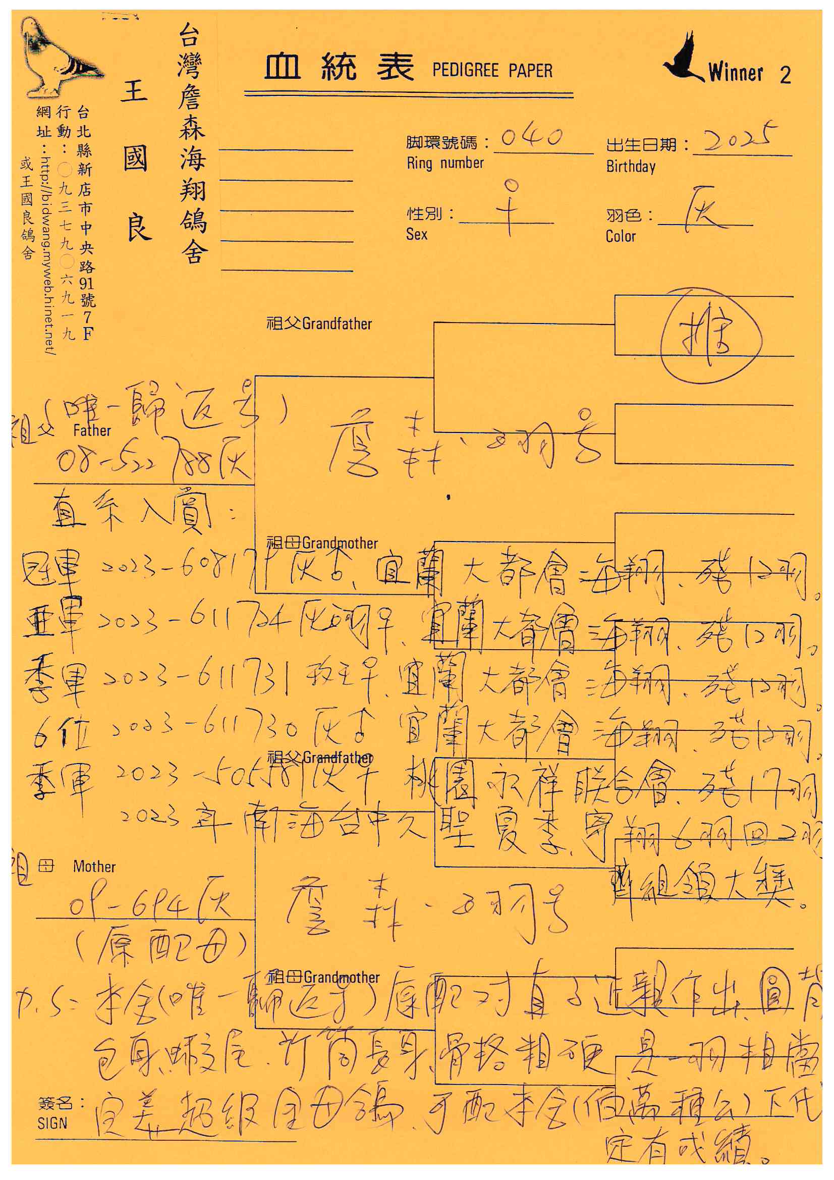 以飼養四季都能入賞詹森系聞名的新店王國良,舍內種鴿皆是詹森家族相互作育而成,能保有詹森系統的特色與優勢。從本身作出參賽和絡繹不絕種鴿提供資訊等各式入賞鴿照,得以知曉王國良的詹森家族威名絕非虛構。近年來王國良年紀漸長,開始減少參賽僅以少數寄翔興趣為主,愛鴿心切的他,期望能讓四季都能入賞的詹森家族在各地發光發熱,所以特別將舍內作育的一線主力高代種鴿分享,透過多年來豐富的參賽與作育經驗,讓惡氣候歸返聞名的詹森家族優良血脈,傳承各地賽場開枝散葉,如此一為,也是作為養鴿人多年的肯定吧!