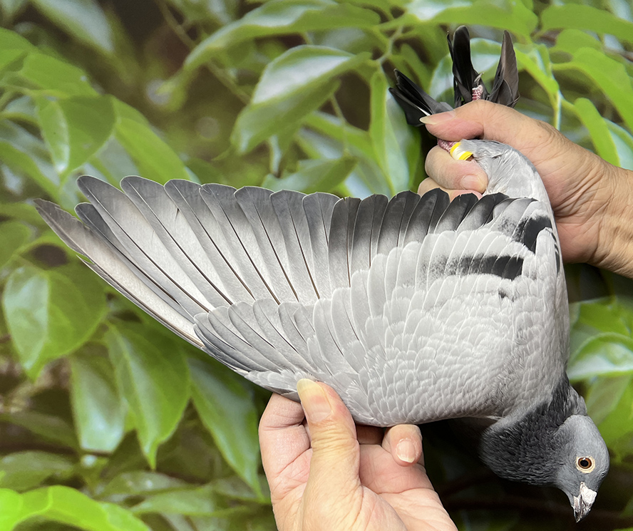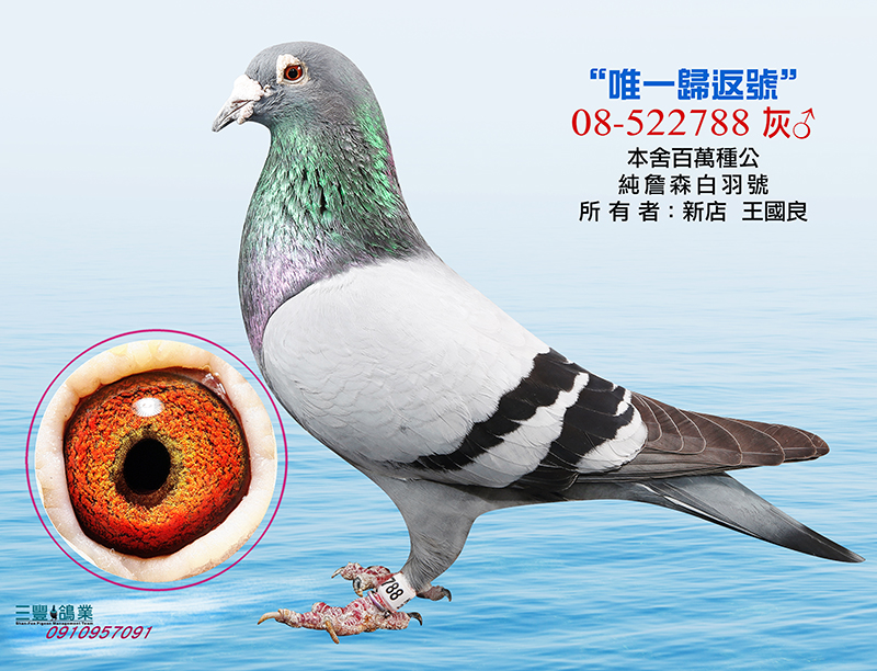 本舍(唯一歸返號)原配對直子近親作出,小型公鴿,包身,圓背,蝦尾,體型相當完美,是一羽優異種公,配本舍佰萬種公或詹森里奇下代,定有好成績。