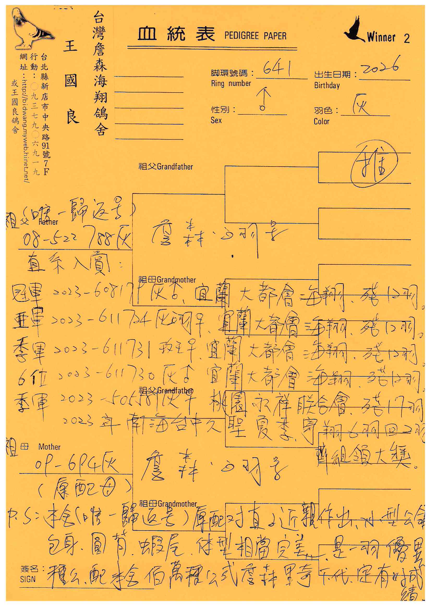 以飼養四季都能入賞詹森系聞名的新店王國良,舍內種鴿皆是詹森家族相互作育而成,能保有詹森系統的特色與優勢。從本身作出參賽和絡繹不絕種鴿提供資訊等各式入賞鴿照,得以知曉王國良的詹森家族威名絕非虛構。近年來王國良年紀漸長,開始減少參賽僅以少數寄翔興趣為主,愛鴿心切的他,期望能讓四季都能入賞的詹森家族在各地發光發熱,所以特別將舍內作育的一線主力高代種鴿分享,透過多年來豐富的參賽與作育經驗,讓惡氣候歸返聞名的詹森家族優良血脈,傳承各地賽場開枝散葉,如此一為,也是作為養鴿人多年的肯定吧!