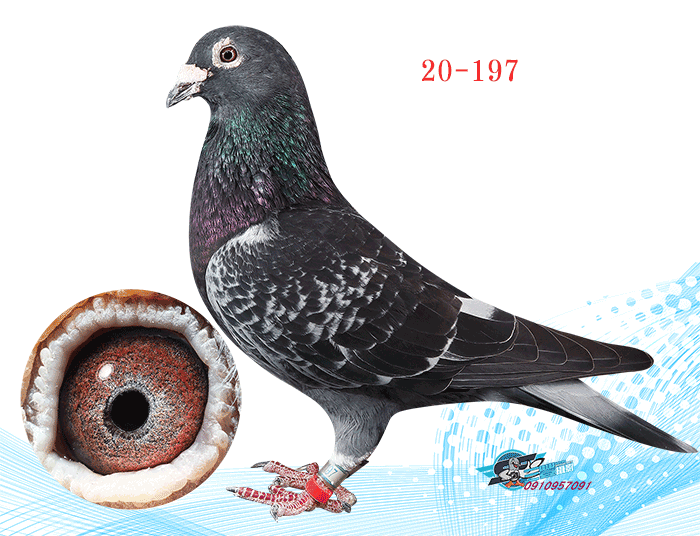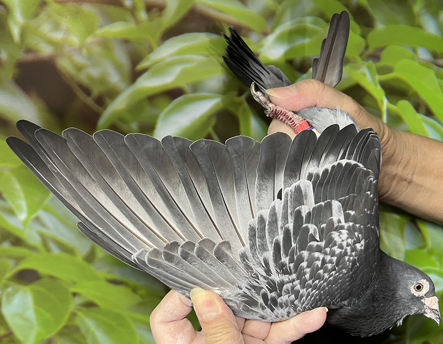 本舍詹森里奇69原配對作出,小型母鴿,包身,圓背,蝦尾,骨骼特硬少肉,全身有力,可耐長時間飛行,尤其南海定可發揮。