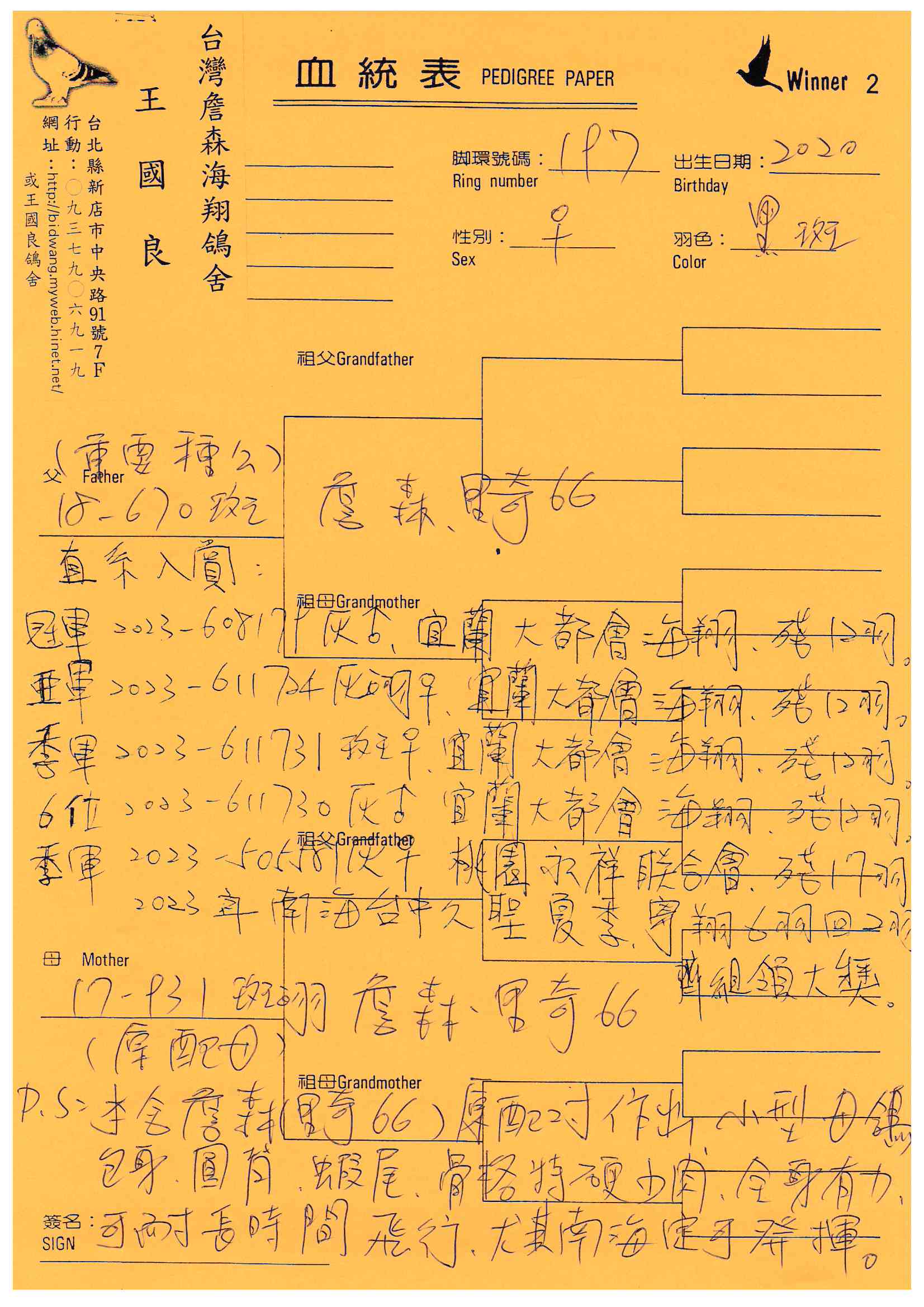 以飼養四季都能入賞詹森系聞名的新店王國良,舍內種鴿皆是詹森家族相互作育而成,能保有詹森系統的特色與優勢。從本身作出參賽和絡繹不絕種鴿提供資訊等各式入賞鴿照,得以知曉王國良的詹森家族威名絕非虛構。近年來王國良年紀漸長,開始減少參賽僅以少數寄翔興趣為主,愛鴿心切的他,期望能讓四季都能入賞的詹森家族在各地發光發熱,所以特別將舍內作育的一線主力高代種鴿分享,透過多年來豐富的參賽與作育經驗,讓惡氣候歸返聞名的詹森家族優良血脈,傳承各地賽場開枝散葉,如此一為,也是作為養鴿人多年的肯定吧!