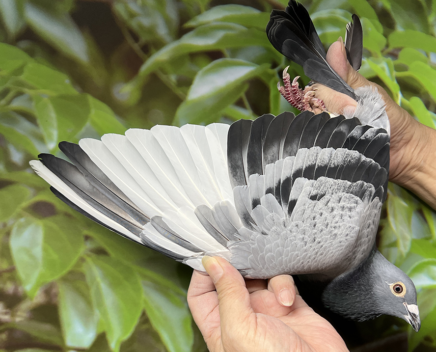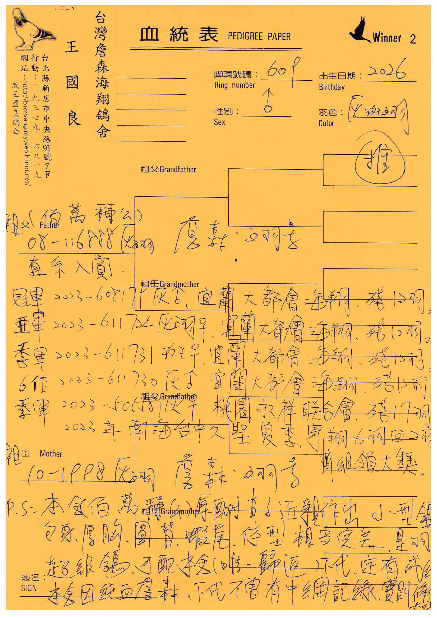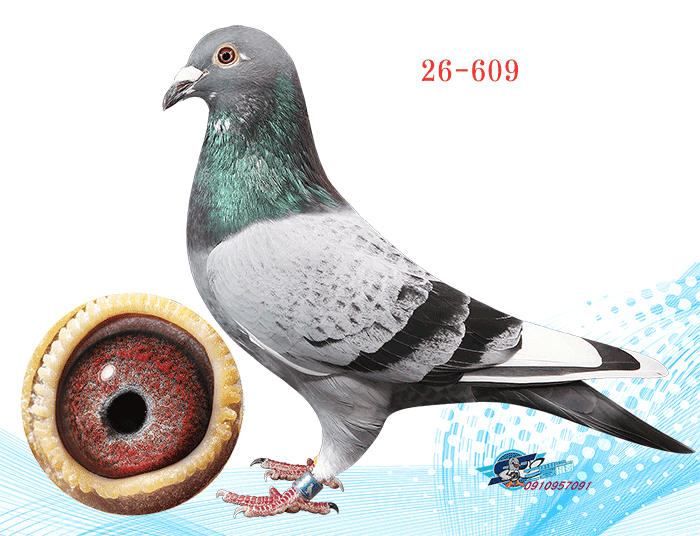 本舍(佰萬種公)原配對直子近親作出,小型鴿,包身,厚胸,圓背,蝦尾,體型相當完美,是羽超級鴿,可配本舍(唯一歸返)下代,定有成績,本舍因純血詹森,下代不曾有中網紀錄,實則條件太好。
