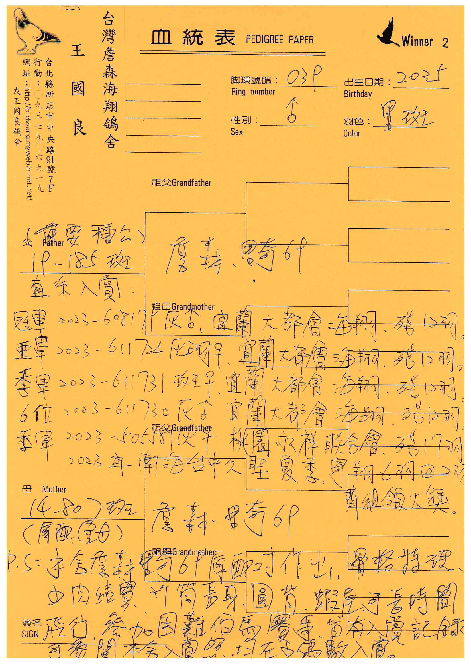 以飼養四季都能入賞詹森系聞名的新店王國良,舍內種鴿皆是詹森家族相互作育而成,能保有詹森系統的特色與優勢。從本身作出參賽和絡繹不絕種鴿提供資訊等各式入賞鴿照,得以知曉王國良的詹森家族威名絕非虛構。近年來王國良年紀漸長,開始減少參賽僅以少數寄翔興趣為主,愛鴿心切的他,期望能讓四季都能入賞的詹森家族在各地發光發熱,所以特別將舍內作育的一線主力高代種鴿分享,透過多年來豐富的參賽與作育經驗,讓惡氣候歸返聞名的詹森家族優良血脈,傳承各地賽場開枝散葉,如此一為,也是作為養鴿人多年的肯定吧!