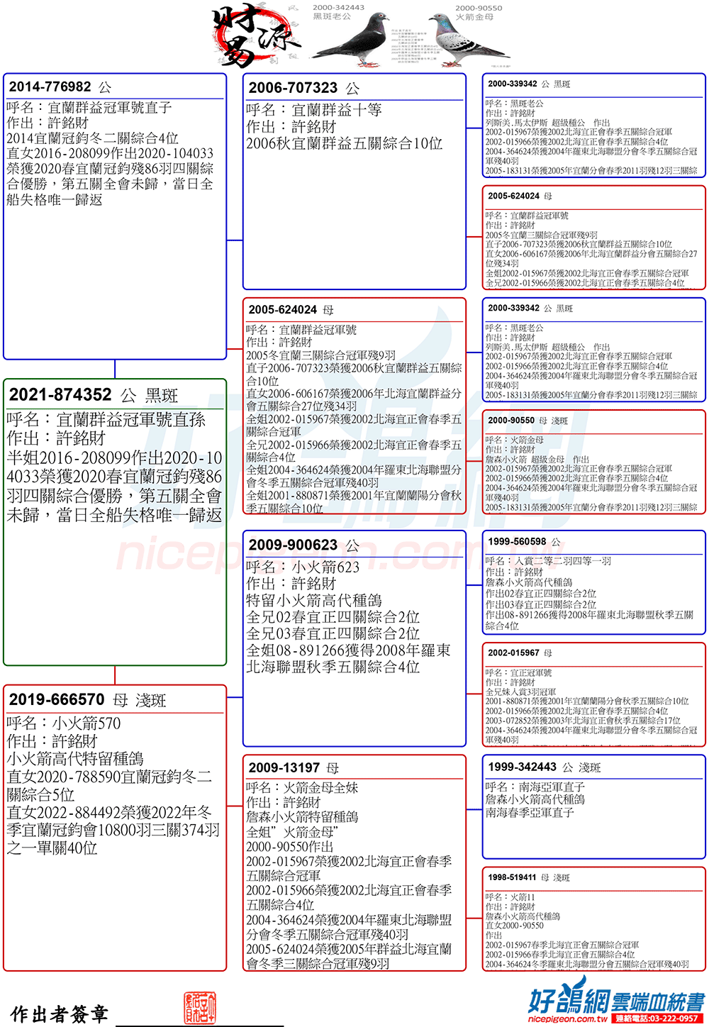 2025年夏季宜蘭聯合會二關綜合8位,環號25-137047灰♂,其父鴿24-993616斑♂,本身入賞夏季三關綜合7位(群益冠軍家族X小火箭三冠家族),母親24-333022,血統為夏季三關綜合亞軍全妹(雙伯馬家族X哈利近親)所作出,許銘財又一次以實戰成績印證了優質血統一脈相承的可貴。
