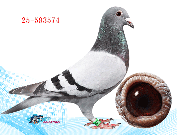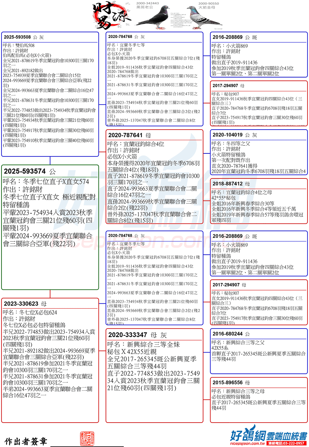 2025年夏季宜蘭聯合會二關綜合8位,環號25-137047灰♂,其父鴿24-993616斑♂,本身入賞夏季三關綜合7位(群益冠軍家族X小火箭三冠家族),母親24-333022,血統為夏季三關綜合亞軍全妹(雙伯馬家族X哈利近親)所作出,許銘財又一次以實戰成績印證了優質血統一脈相承的可貴。