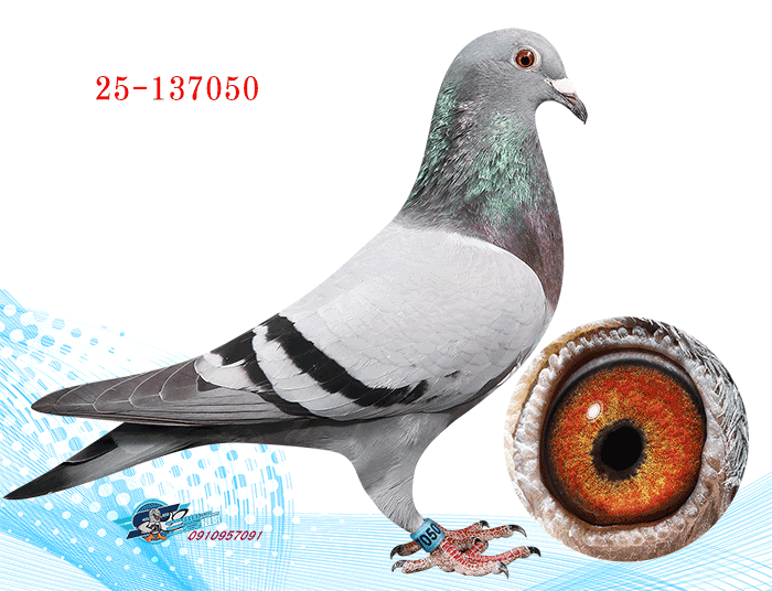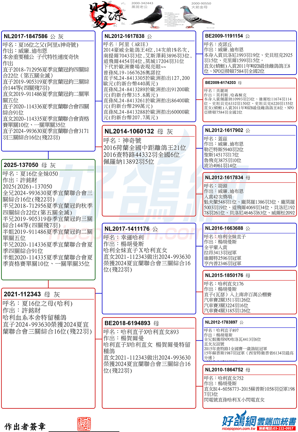2025年夏季宜蘭聯合會二關綜合8位,環號25-137047灰♂,其父鴿24-993616斑♂,本身入賞夏季三關綜合7位(群益冠軍家族X小火箭三冠家族),母親24-333022,血統為夏季三關綜合亞軍全妹(雙伯馬家族X哈利近親)所作出,許銘財又一次以實戰成績印證了優質血統一脈相承的可貴。
