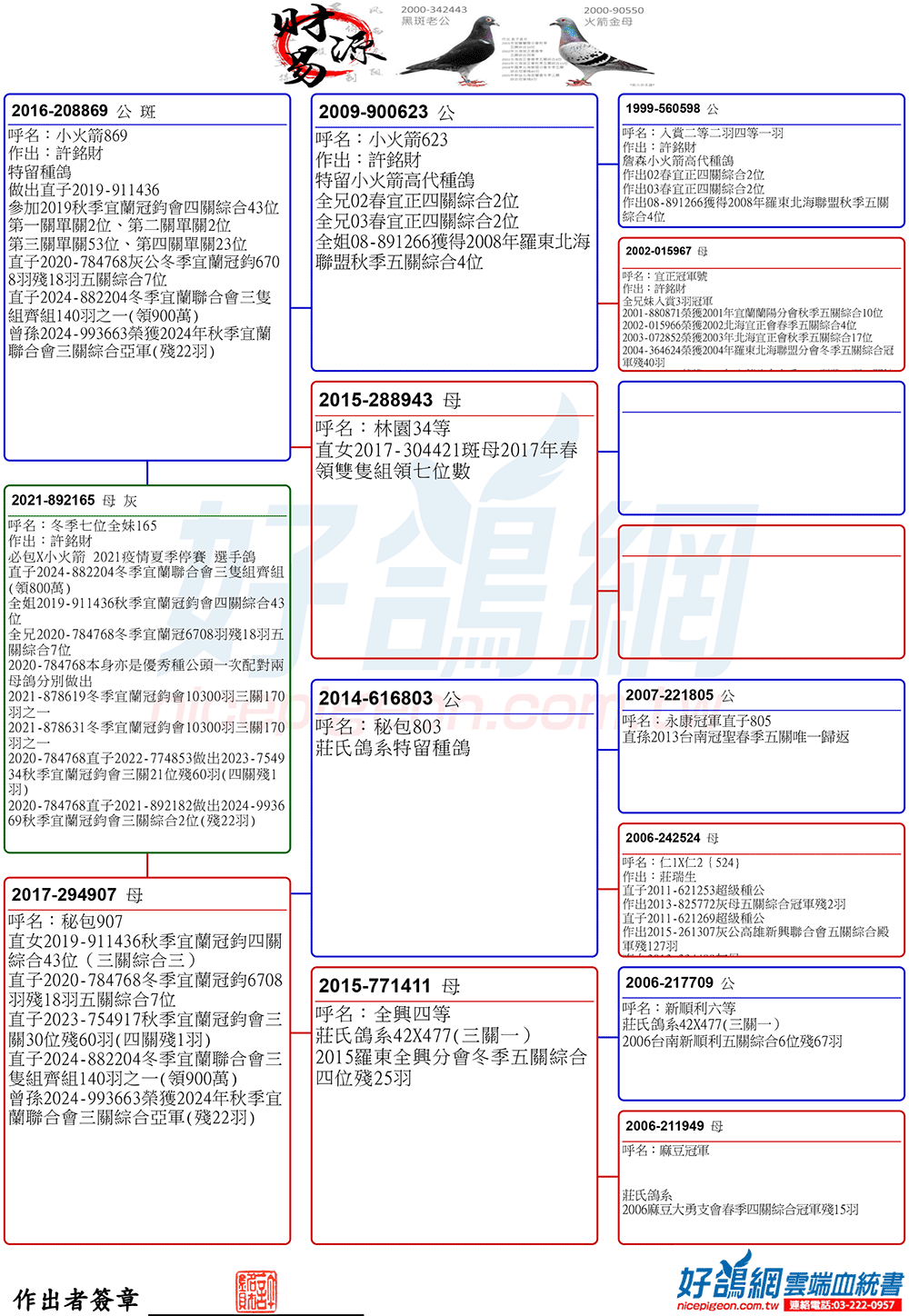 2025年夏季宜蘭聯合會二關綜合8位,環號25-137047灰♂,其父鴿24-993616斑♂,本身入賞夏季三關綜合7位(群益冠軍家族X小火箭三冠家族),母親24-333022,血統為夏季三關綜合亞軍全妹(雙伯馬家族X哈利近親)所作出,許銘財又一次以實戰成績印證了優質血統一脈相承的可貴。