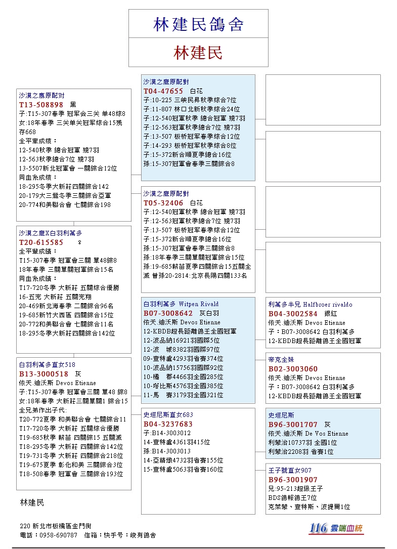 以“快客B08-3180121花頭白羽♂為核心,其血統出自芮娜父女本舍作出,父鴿046為中距離鴿王冠軍“超級快客”X克莉絲所作出,其直子入賞新和順夏季綜合34位、中港冬季綜合19位、直女入賞三峽民昇秋季綜合3位、林口北新秋季綜合18位,目前已發揮至第五代,快客下代在該舍可說是耐力與速度兼具的奪標主力,快客在9歲高齡還作出伯馬子代,其優秀遺傳力可見一斑。
