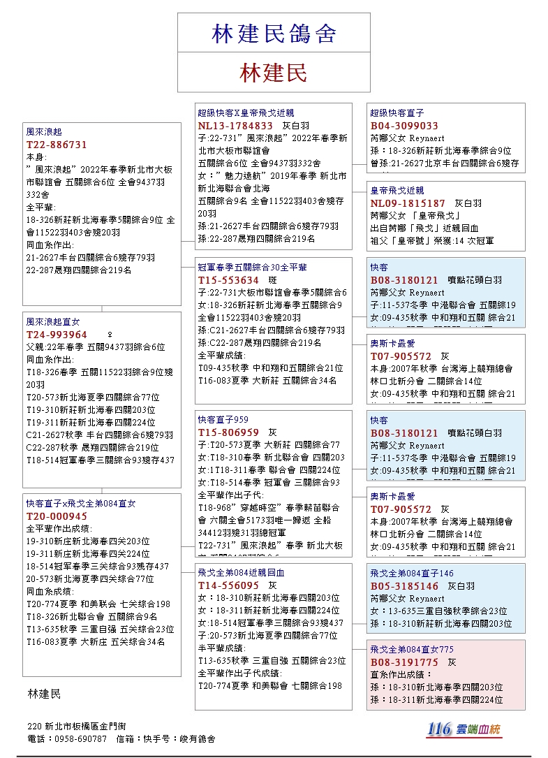 在兩岸競翔圈享有盛名,曾經五度拿下全船總冠軍(二次全會唯一歸返、一次全船唯一歸返),並在大陸指標鴿會北京開創者,勇奪鐵鷹四關綜合冠軍、天津開創者國際俱樂部多次贏得鉅獎的土城林建民鴿舍,因生涯規劃,即將前往大陸發展事業,因而決定將鴿舍4百餘羽種賽鴿,全數分批在好鴿網平台公開拍賣,第一批將於2026年元月份搶先上架,敬請鴿友把握引種良機。