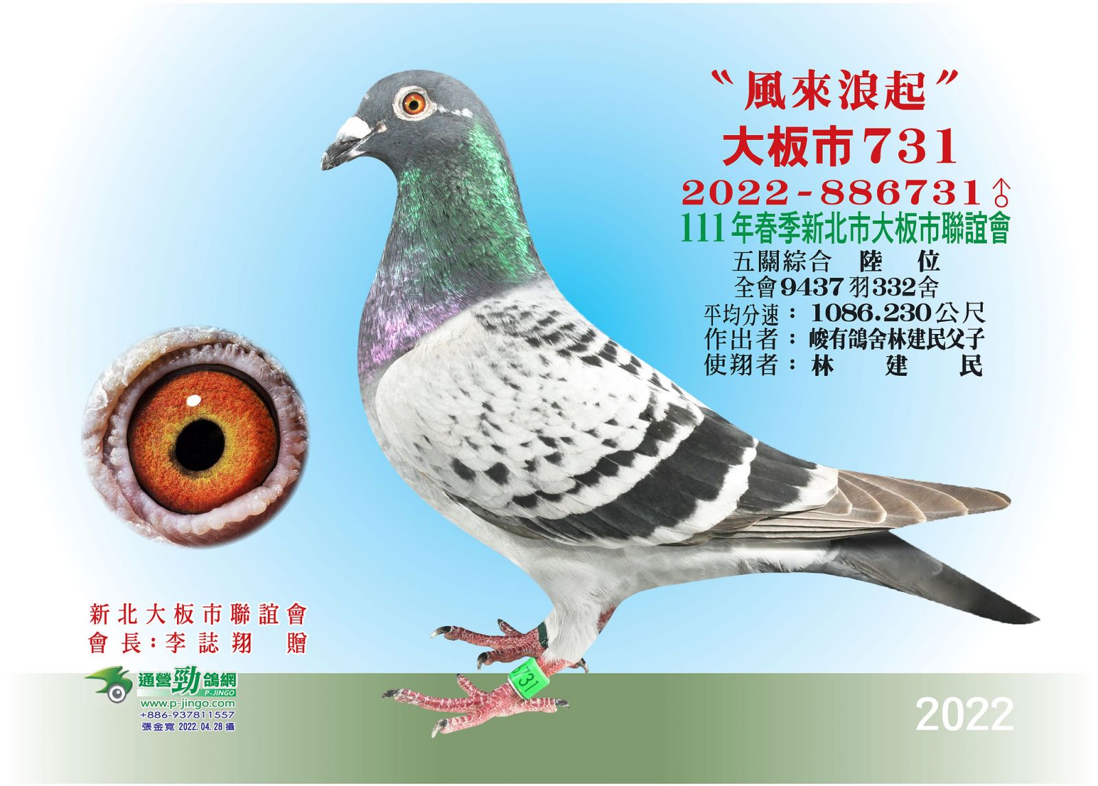 ▲父鴿:T22-886731春季新北大阪9437羽五關綜合6位