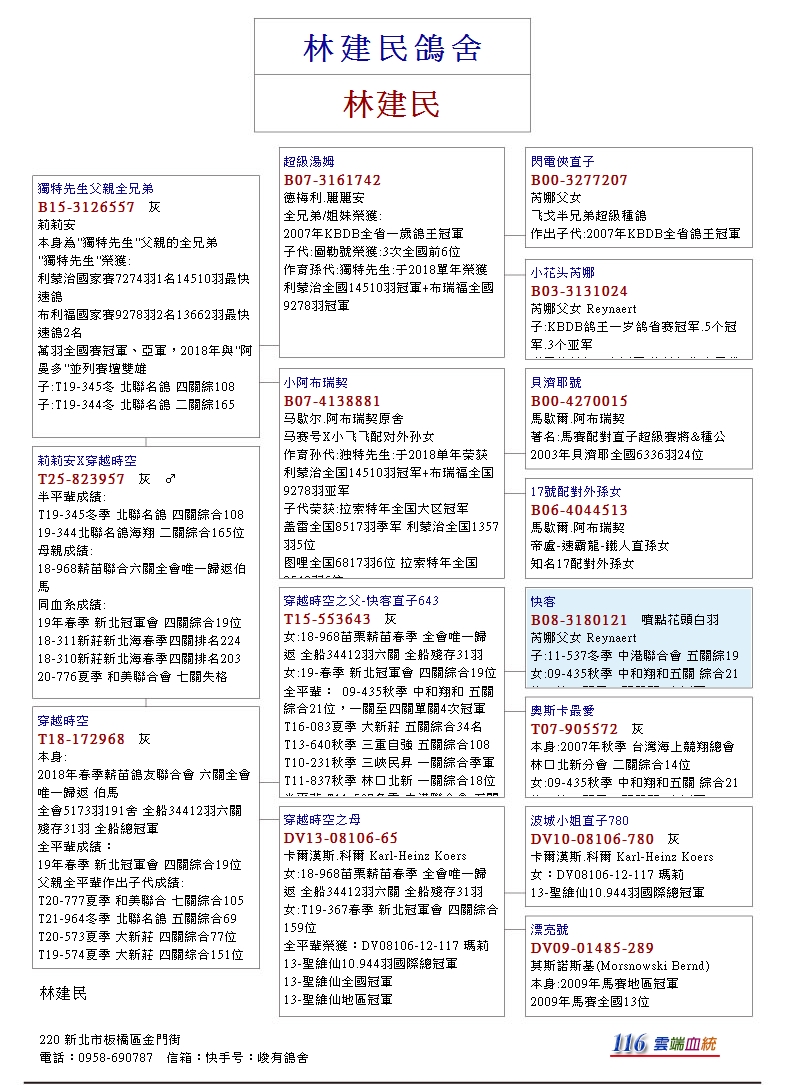 以“快客B08-3180121花頭白羽♂為核心,其血統出自芮娜父女本舍作出,父鴿046為中距離鴿王冠軍“超級快客”X克莉絲所作出,其直子入賞新和順夏季綜合34位、中港冬季綜合19位、直女入賞三峽民昇秋季綜合3位、林口北新秋季綜合18位,目前已發揮至第五代,快客下代在該舍可說是耐力與速度兼具的奪標主力,快客在9歲高齡還作出伯馬子代,其優秀遺傳力可見一斑。
