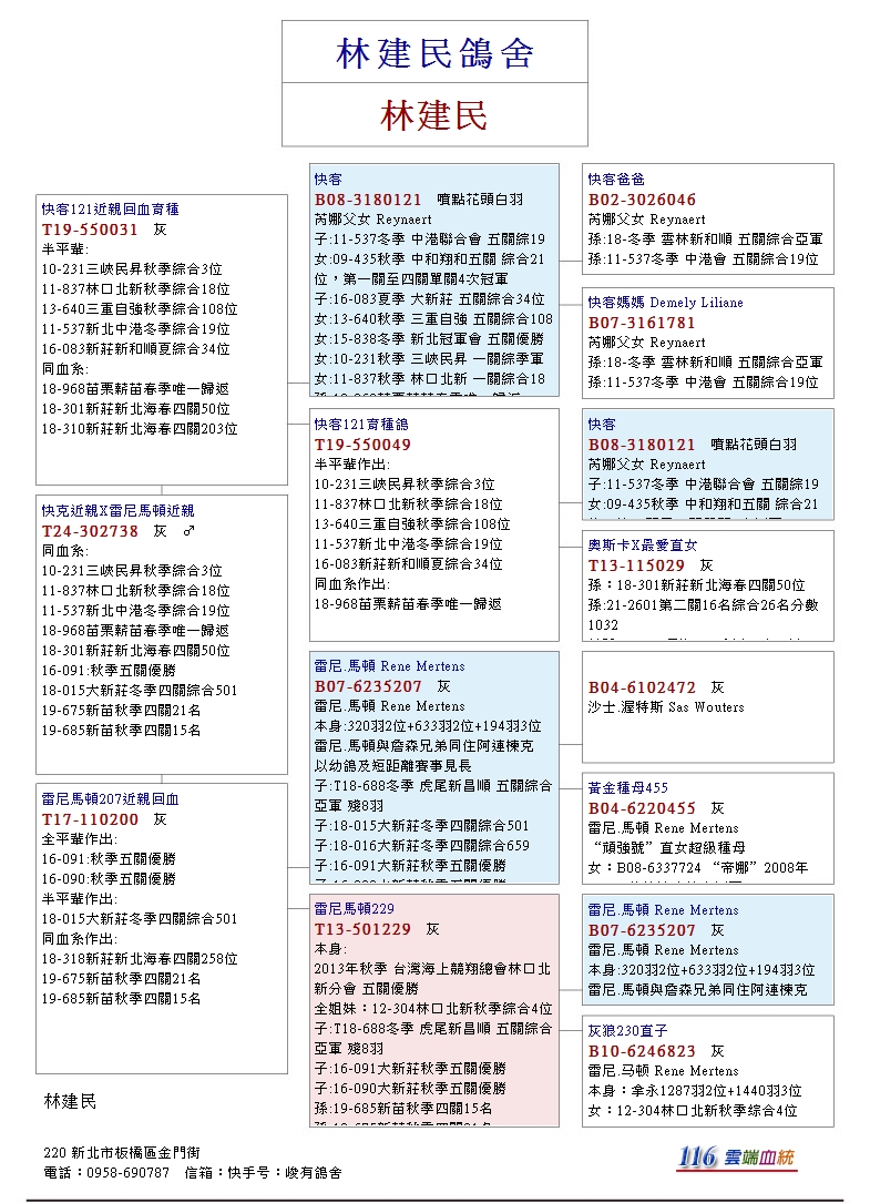 以“快客B08-3180121花頭白羽♂為核心,其血統出自芮娜父女本舍作出,父鴿046為中距離鴿王冠軍“超級快客”X克莉絲所作出,其直子入賞新和順夏季綜合34位、中港冬季綜合19位、直女入賞三峽民昇秋季綜合3位、林口北新秋季綜合18位,目前已發揮至第五代,快客下代在該舍可說是耐力與速度兼具的奪標主力,快客在9歲高齡還作出伯馬子代,其優秀遺傳力可見一斑。