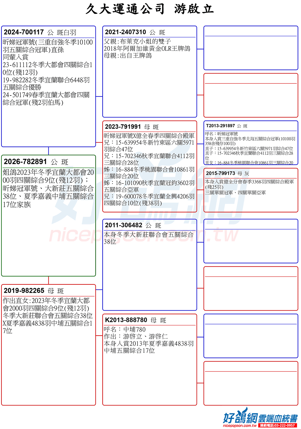 《宜蘭大都會未賽鴿》姐鴿2023年冬季宜蘭大都會2000羽四關綜合9位(殘12羽);昕娣冠軍號、大新莊五關綜合38位、夏季嘉義中埔五關綜合17位家族