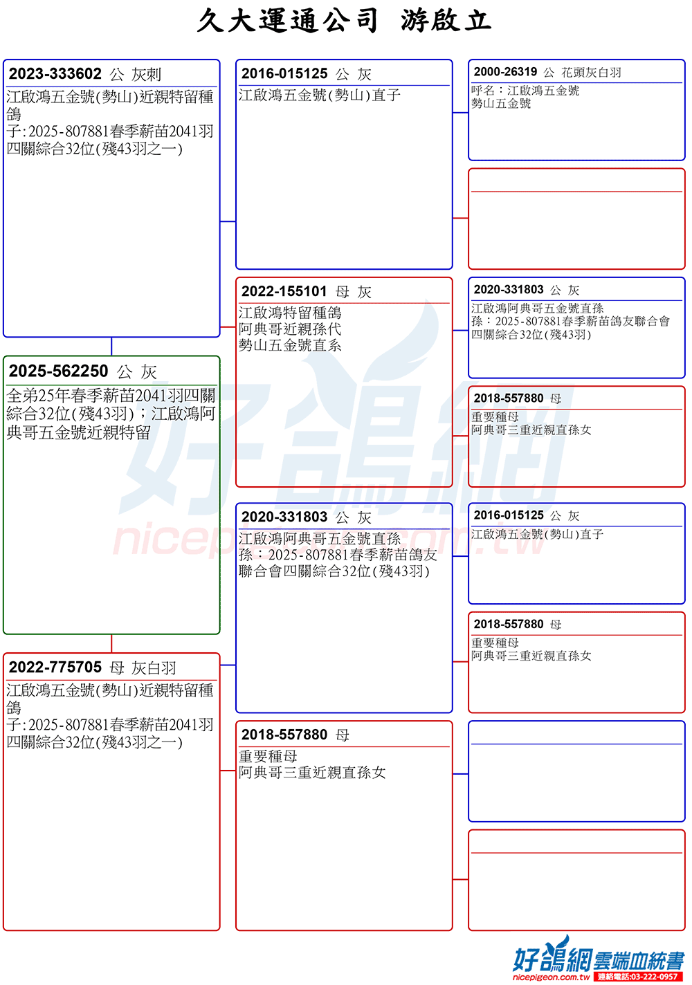 全弟25年春季薪苗2041羽四關綜合32位(殘43羽);江啟鴻阿典哥五金號近親特留
