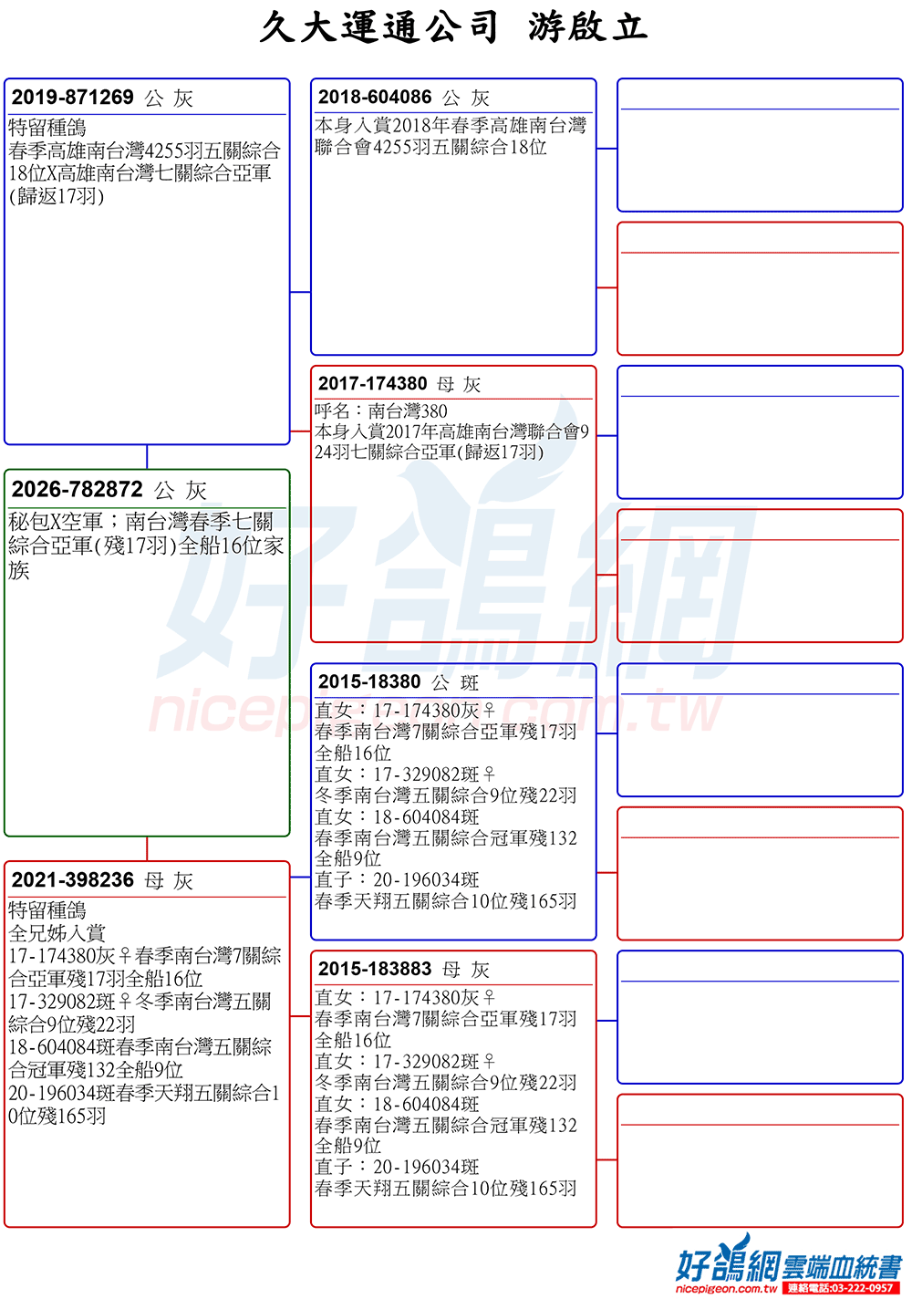 這一次,好鴿網特別邀請游董參與拍賣會,首次釋出多羽「昕娣冠軍號」的家族鴿。這不僅是難得的交流契機,更是鴿友們引進頂級血統、提升鴿舍實力的絕佳良機。憑藉游董數十年穩健作育與屢屢奪冠的實績,相信這批鴿將為各地鴿友帶來新的希望與戰力。