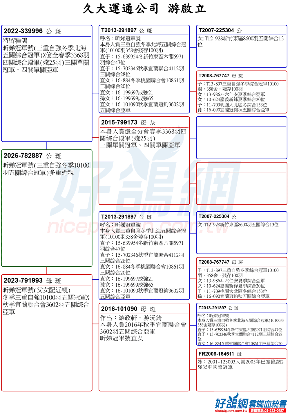 《宜蘭大都會未賽鴿》昕娣冠軍號(三重自強冬季10100羽五關綜合冠軍)多重近親