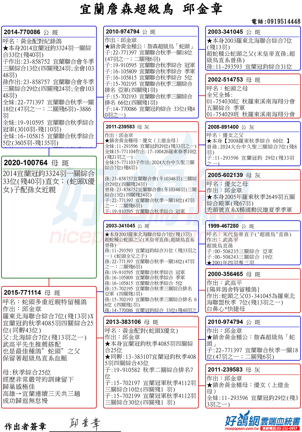 「超級鳥蛇頭」與「上億金母優女」這個黃金組合,為邱金章鴿舍打下穩固的基石,作出不計其數的入賞鴿,為邱金章的海翔成績取得巨大的成就。
