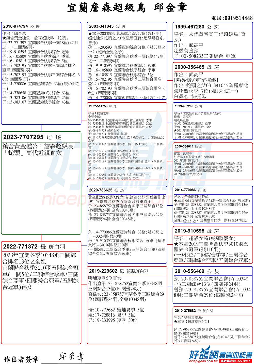「超級鳥蛇頭」與「上億金母優女」這個黃金組合,為邱金章鴿舍打下穩固的基石,作出不計其數的入賞鴿,為邱金章的海翔成績取得巨大的成就。