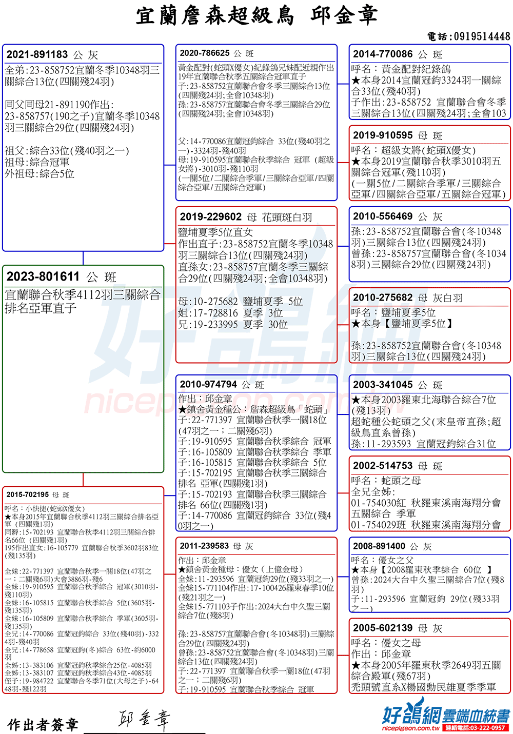 「超級鳥蛇頭」與「上億金母優女」這個黃金組合,為邱金章鴿舍打下穩固的基石,作出不計其數的入賞鴿,為邱金章的海翔成績取得巨大的成就。