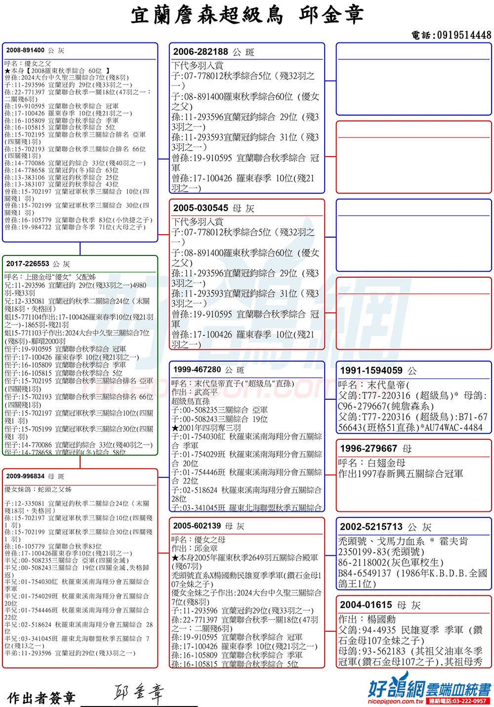 「超級鳥蛇頭」與「上億金母優女」這個黃金組合,為邱金章鴿舍打下穩固的基石,作出不計其數的入賞鴿,為邱金章的海翔成績取得巨大的成就。