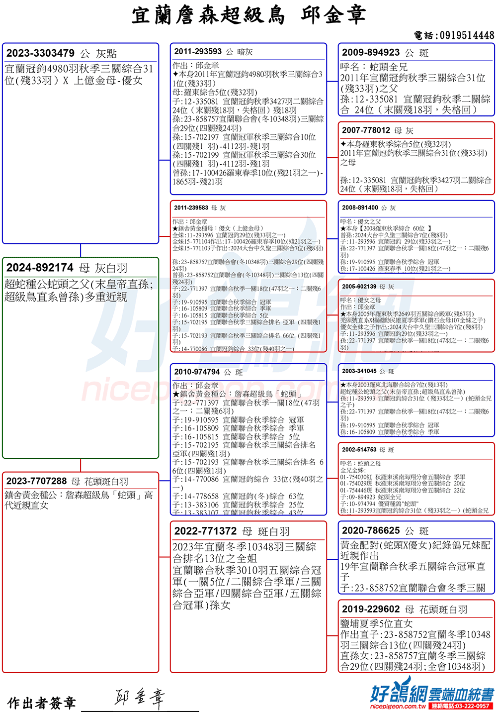 「超級鳥蛇頭」與「上億金母優女」這個黃金組合,為邱金章鴿舍打下穩固的基石,作出不計其數的入賞鴿,為邱金章的海翔成績取得巨大的成就。
