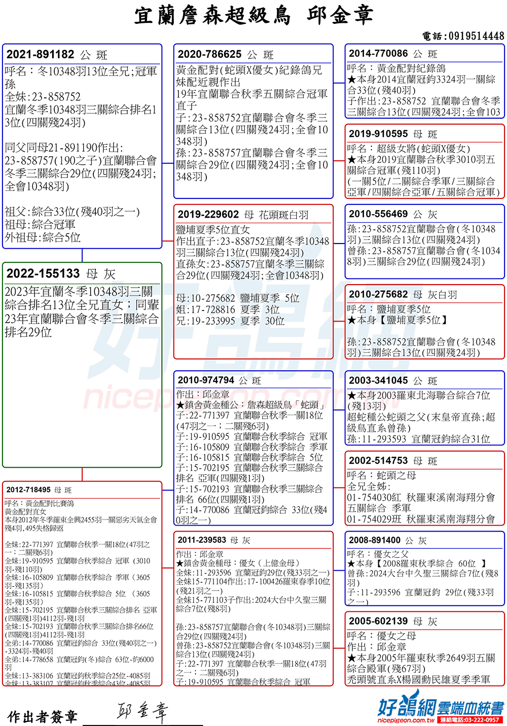 「超級鳥蛇頭」與「上億金母優女」這個黃金組合,為邱金章鴿舍打下穩固的基石,作出不計其數的入賞鴿,為邱金章的海翔成績取得巨大的成就。