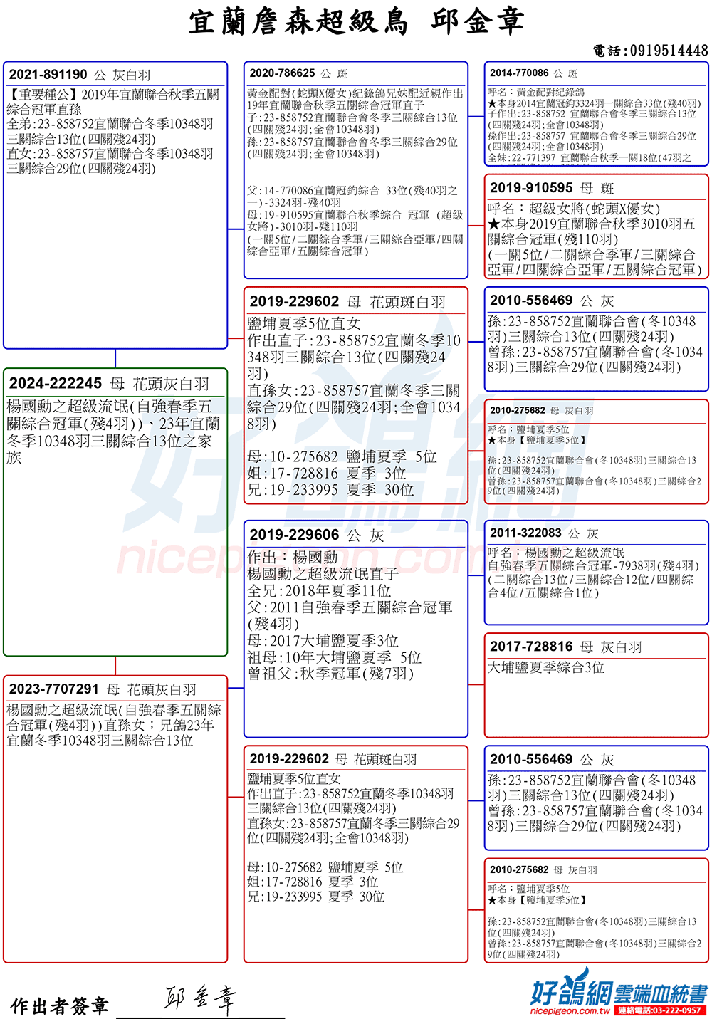 「超級鳥蛇頭」與「上億金母優女」這個黃金組合,為邱金章鴿舍打下穩固的基石,作出不計其數的入賞鴿,為邱金章的海翔成績取得巨大的成就。
