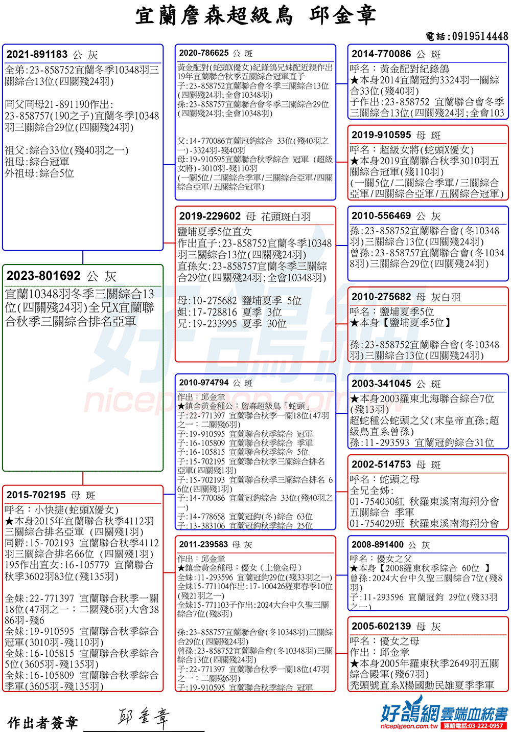 「超級鳥蛇頭」與「上億金母優女」這個黃金組合,為邱金章鴿舍打下穩固的基石,作出不計其數的入賞鴿,為邱金章的海翔成績取得巨大的成就。