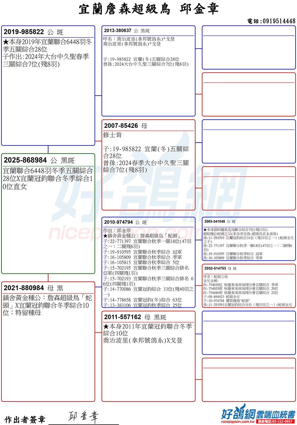 邱金章也導入高雄強豪邱氏兄弟的超級鳥家族,邱氏兄弟的超級鳥家族在南海賽事所向披靡。好的鴿種不分賽季與地區,邱金章引進之後也作出2025年宜蘭夏季2195羽一關綜合排名55位,足可顯示詹森超級鳥不凡的競賽能力。