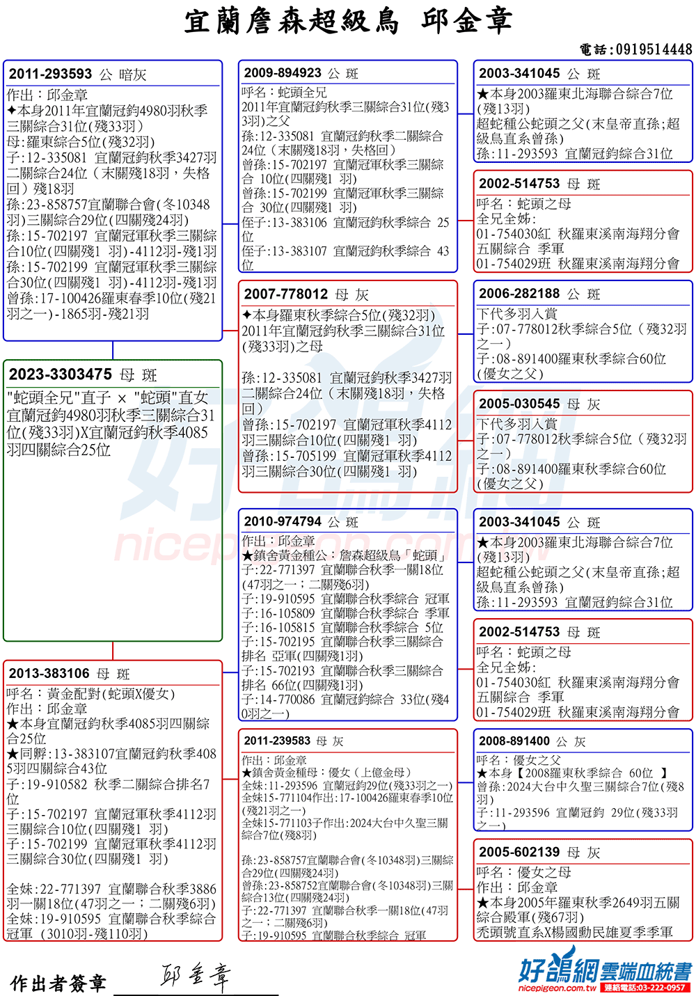 「超級鳥蛇頭」與「上億金母優女」這個黃金組合,為邱金章鴿舍打下穩固的基石,作出不計其數的入賞鴿,為邱金章的海翔成績取得巨大的成就。