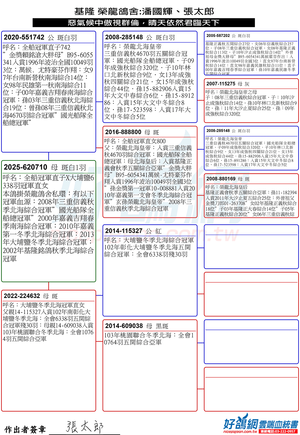 據了解,榮龍鴿舍現役育種主力,包括三重信義秋季五關綜合冠軍,國光船隊全船總冠軍,汐止成強秋季綜合冠軍,大新泰春季綜合冠軍之外,近期更是導入多羽戰功彪炳的實戰綜合冠軍直子女,包括大北區春季13630羽殘66羽五關綜合冠軍,北海船隊全船總冠軍直女,嘉義民雄第一支會冬季3115羽殘35羽五關綜合冠軍,全船總冠軍直女,雙北聯盟夏季3456羽殘3羽伯馬四關綜合冠軍,大草屯冬季11317羽殘30羽五關綜合冠軍直子女,竹南大新冬季2677羽殘3羽伯馬六關綜合冠軍直女,南臺灣夏季七關綜合冠軍直女,彰化大埔塩冬季6338羽殘30羽五關綜合冠軍直女。